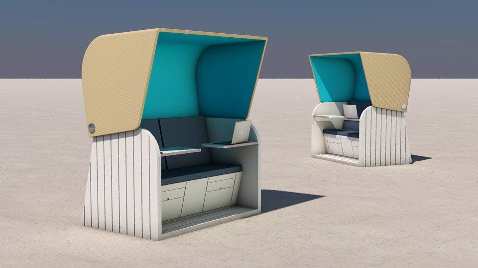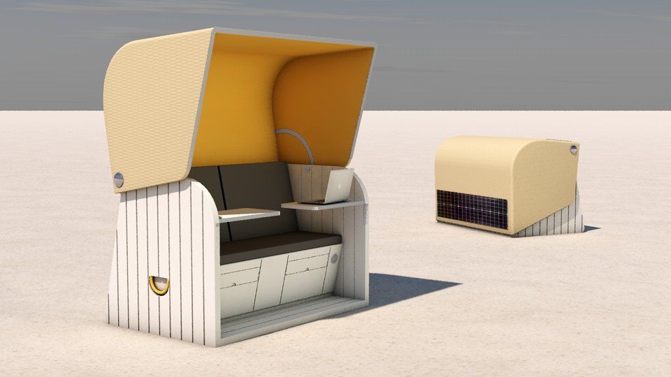 - Ein Solarstrandkorb als temporärer Arbeitsplatz zur Outdoor-Nutzung tragbarer digitaler Geräte.